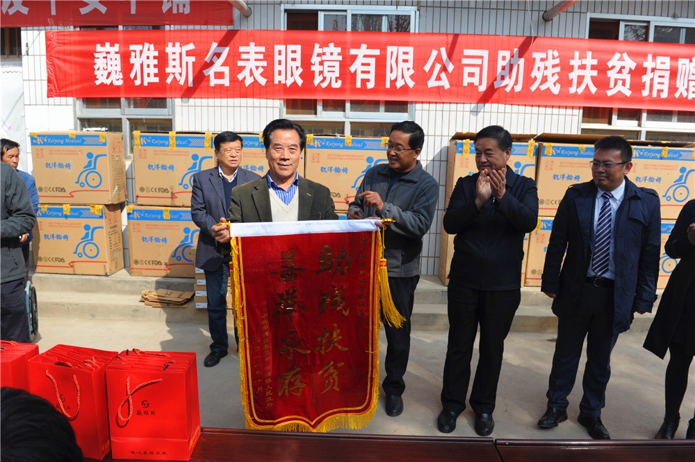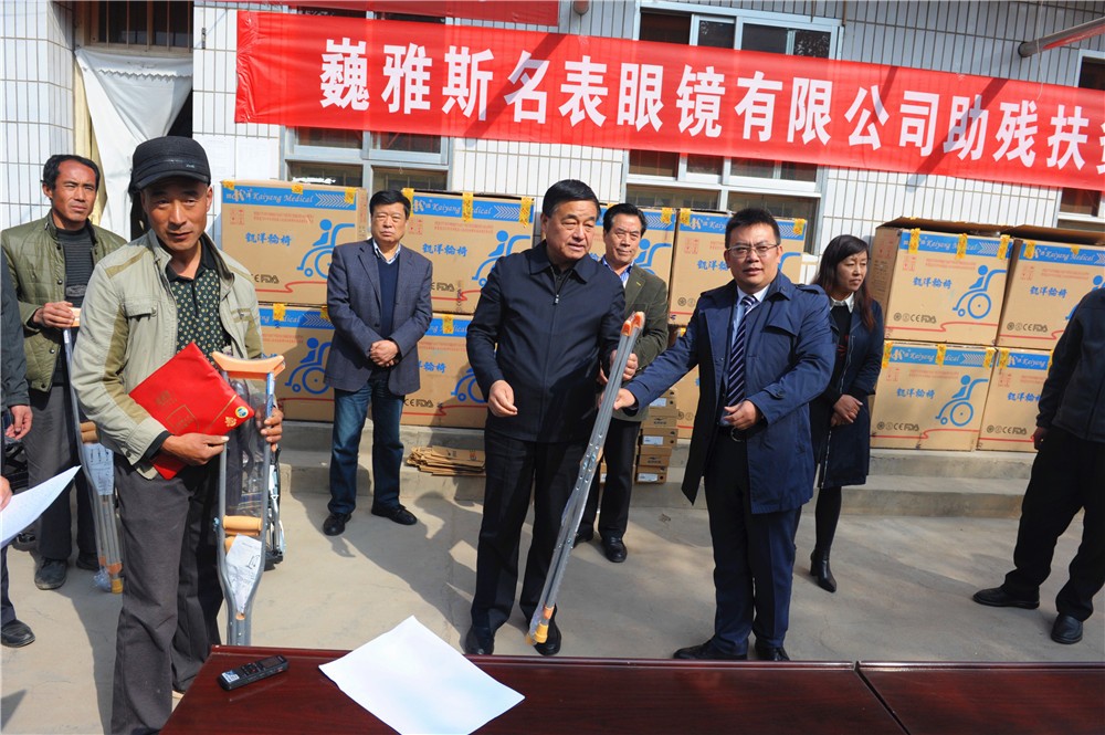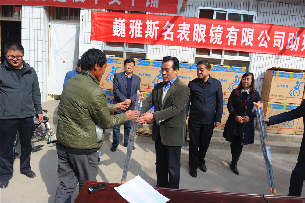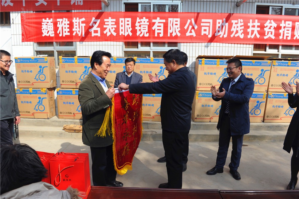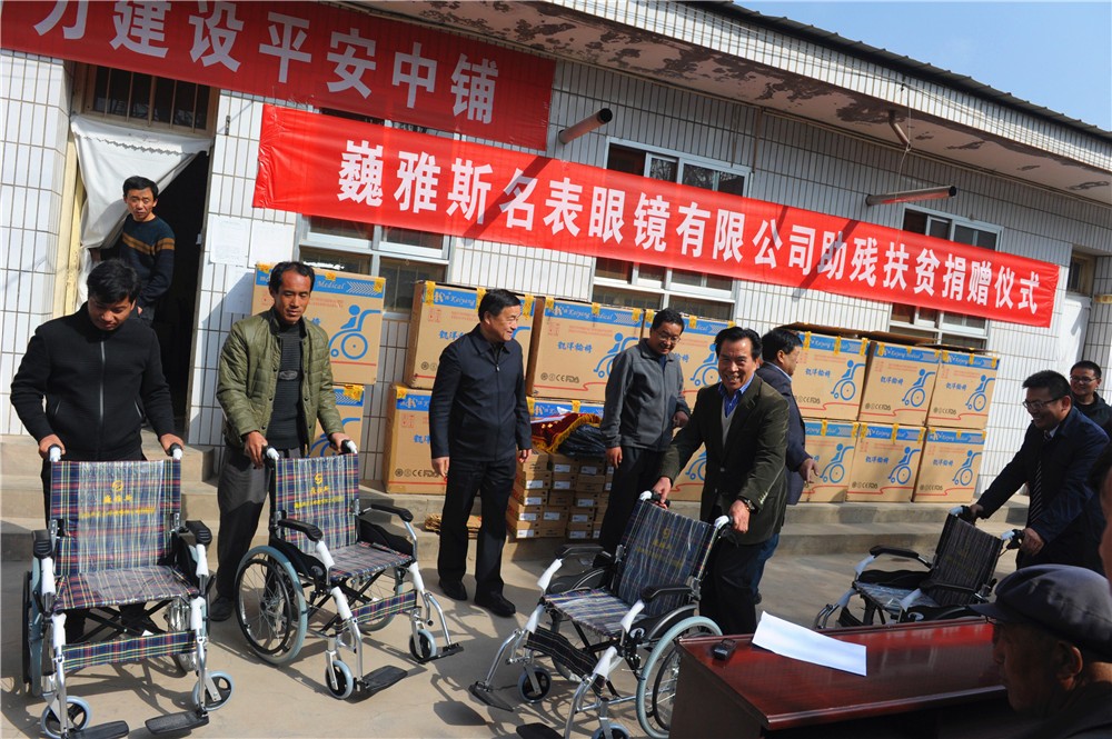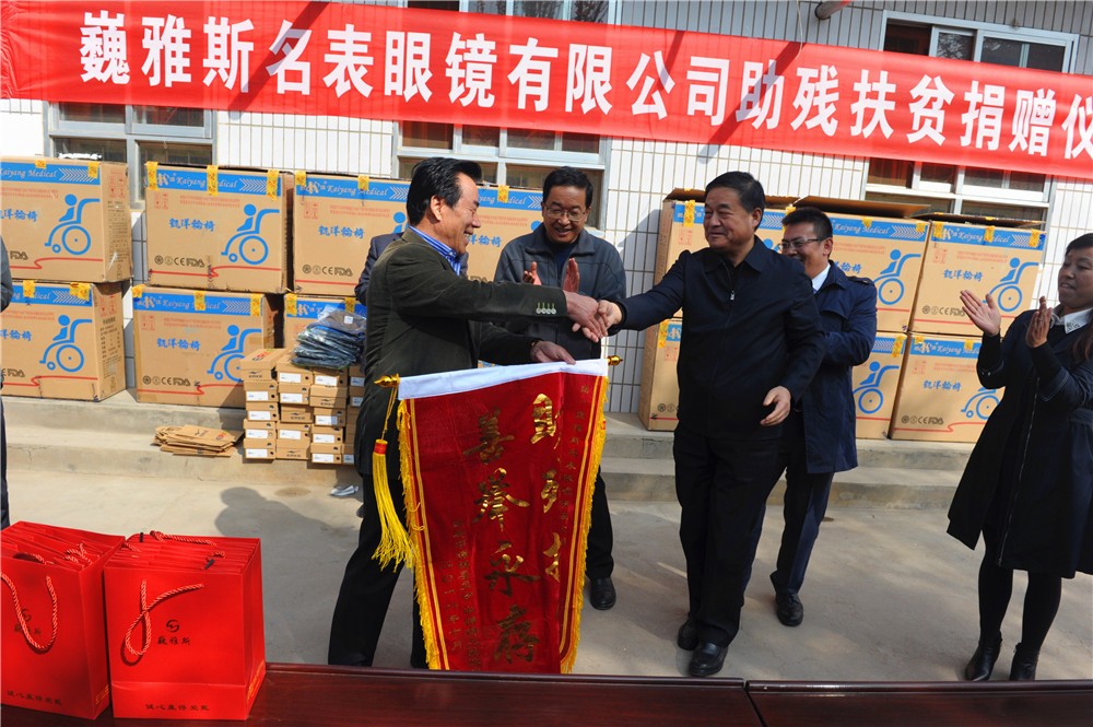 10月24日上午,巍雅斯名表眼鏡有限公司助殘扶貧捐贈儀式在臨洮縣中鋪鎮(zhèn)政府舉行,巍雅斯名表眼鏡有限公司向中鋪鎮(zhèn)殘疾人資助了19100元現(xiàn)金并捐贈了價值11970元的輪椅及拐杖等,希望能夠解決受捐助的殘疾人當前的困難。臨洮縣人大常委會主任蔣景林參加捐贈儀式并講話,高度評價了巍雅斯在社會公益慈善事業(yè)常年來所做的努力。