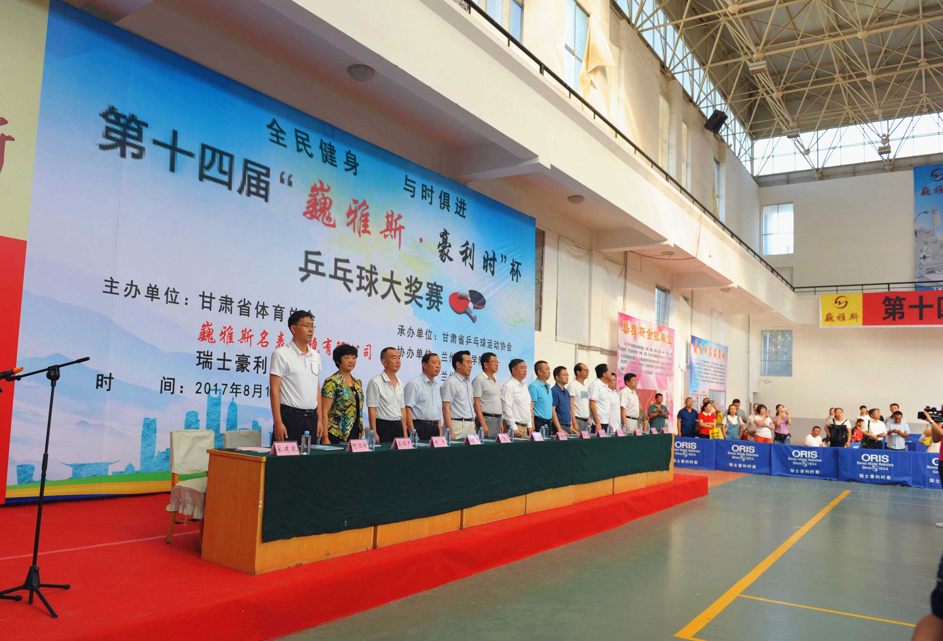 中國商業(yè)聯(lián)合會鐘表商分會副會長、甘肅省眼鏡協(xié)會會長、甘肅省乒乓球協(xié)會副會長、巍雅斯名表眼鏡有限公司董事長裴正江,瑞士豪利時表中國區(qū)總經(jīng)理嚴明輝先生及有關(guān)領(lǐng)導、運動員、裁判員、教練員、工作人員一千兩百多人參加了簡樸但氣氛熱烈的大獎賽開幕式。