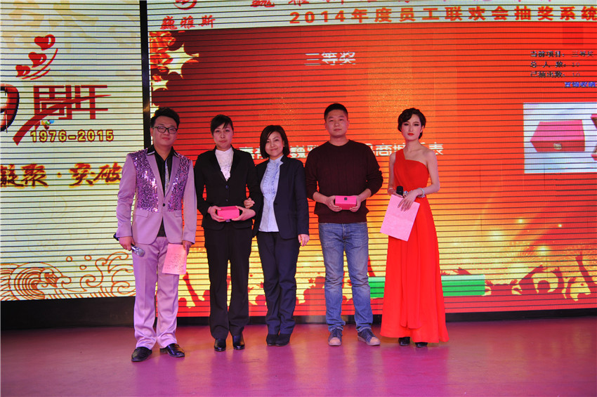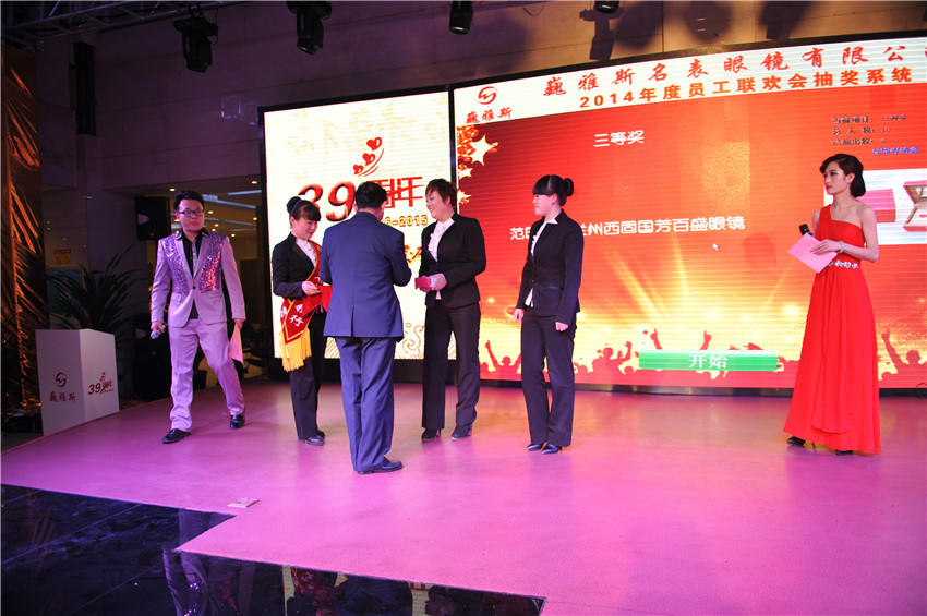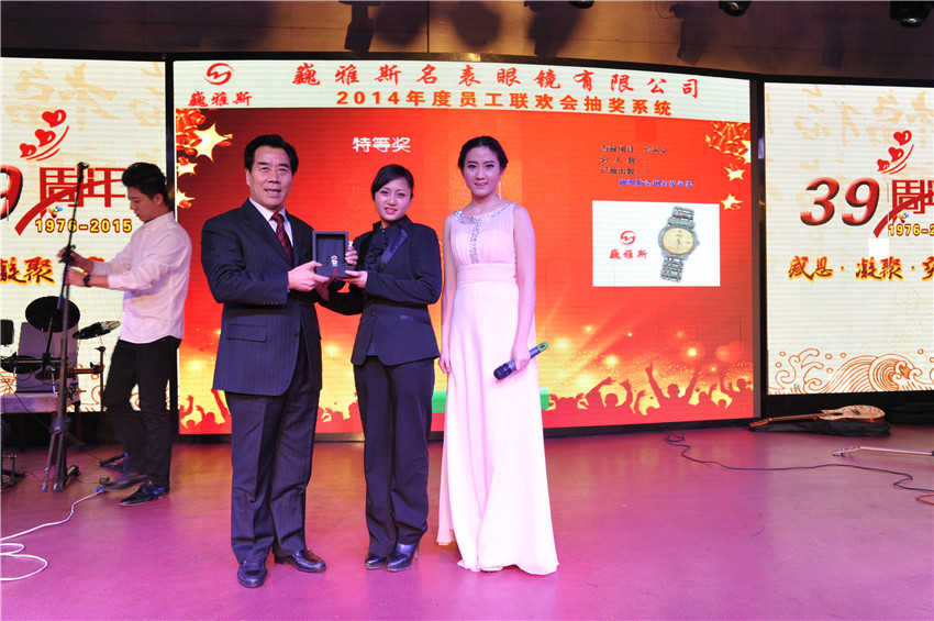 在總結(jié)暨表彰大會(huì)上,巍雅斯名表眼鏡有限公司總裁就2014年各分公司和部門(mén)的各項(xiàng)情況做了總結(jié),對(duì)2015年的各項(xiàng)工作提出了規(guī)劃及要求。并指出:在過(guò)去的2014年雖然受整體經(jīng)濟(jì)環(huán)境的影響,但巍雅斯名表眼鏡有限公司的各項(xiàng)業(yè)績(jī)均取得了預(yù)期的目標(biāo)。相信2015年,在公司上下的團(tuán)結(jié)努力下,將會(huì)取得更輝煌的成就??偨Y(jié)暨表彰大會(huì)隨后表彰了在2014年涌現(xiàn)出的35名“先進(jìn)工作者”及5個(gè)“先進(jìn)集體”。在隨后舉行的2014年度員工聯(lián)歡會(huì)上,來(lái)自各分公司(分部)選送的精彩聯(lián)歡節(jié)目和幸運(yùn)抽獎(jiǎng)為所有的參會(huì)人員帶來(lái)了歡樂(lè),將聯(lián)歡會(huì)的氣氛推向了高潮。