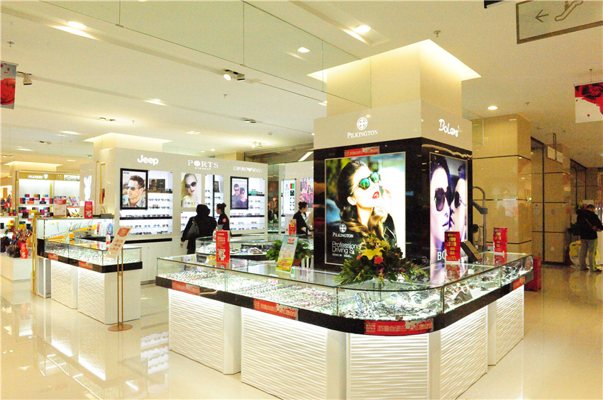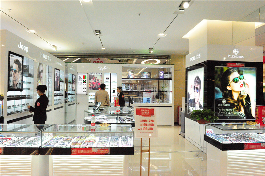 眼鏡區(qū)域位于萬達百貨二樓扶梯旁,配備有先進的進口驗光設備,能夠為顧客提供專業(yè)、細致的驗光服務,并陳列有各種花色的太陽鏡和鏡架供顧客選擇。