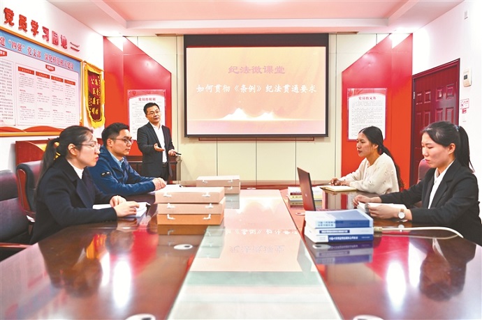 江西省新余市紀(jì)委監(jiān)委不斷強化紀(jì)檢監(jiān)察干部對執(zhí)紀(jì)執(zhí)法貫通理念的理解運用,建立“通報講評”機制,針對實踐中發(fā)現(xiàn)的難點問題及時分析講解,提升案件辦理質(zhì)效。圖為該市紀(jì)委監(jiān)委案件審理室圍繞新修訂的紀(jì)律處分條例,解讀紀(jì)法銜接條款的理解運用。黃磊 攝