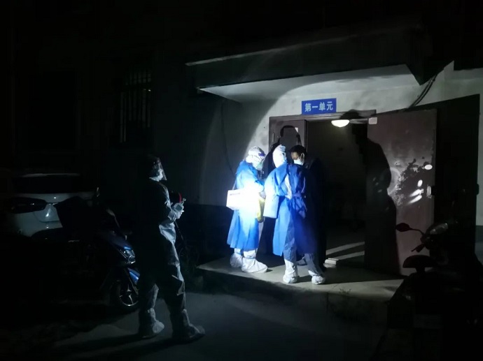 在做好防護準備后,扯起嗓門開始耐心的給即將入睡的百姓做起動員。在疫情期間,經歷了漫長的等待,蝸居在家的市民大多習慣了早晚無序的核酸檢測,但還有不少以身體不適、經不起“磨煉”等理由進行躲避、抗拒,隊員們不厭其煩,只能冒著風險逐戶登門做思想工作。舉燈踱步、排門逐戶做完檢測一眨眼三個多小時過去了,再做好試管封裝,數據統(tǒng)計、校對后已至子夜后半段,深秋微涼的晚風已被隊員的熱情牢牢抵御在防護服之外。