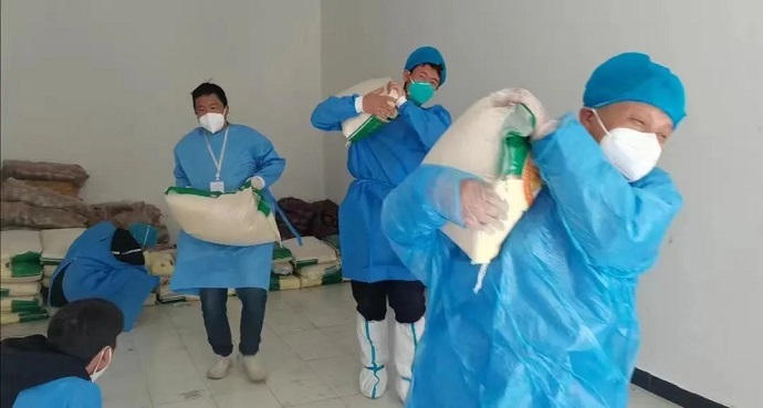 還來不及調整夜班后的身體疲倦,次日中午時分,志愿服務隊就收到了社區(qū)進行國慶政府慰問物資配送的通知。為保證社區(qū)居民能享受到最新鮮、及時的慰問物資,隊員們重打前一晚的雞血,頂著淅淅瀝瀝的小雨和感冒被感染的風險,再次手抓肩扛,將包裝完好的合計約5噸的糧油水果送到了居民手中。匆忙的腳步、簡單的交流,也讓社區(qū)百姓們漸漸讀懂了志愿服務隊的初心。