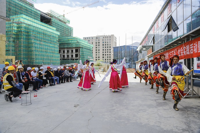 在能源基地項目現(xiàn)場,青春洋溢的大學生隊員們以特色舞蹈展現(xiàn)了西藏地方文化。西藏大學帶隊老師向工人代表贈送了應急處置知識包,并向參建工人普及日常應急知識。隨后,師生們在集團公司安全監(jiān)管人員的帶領下,參觀了能源基地項目。