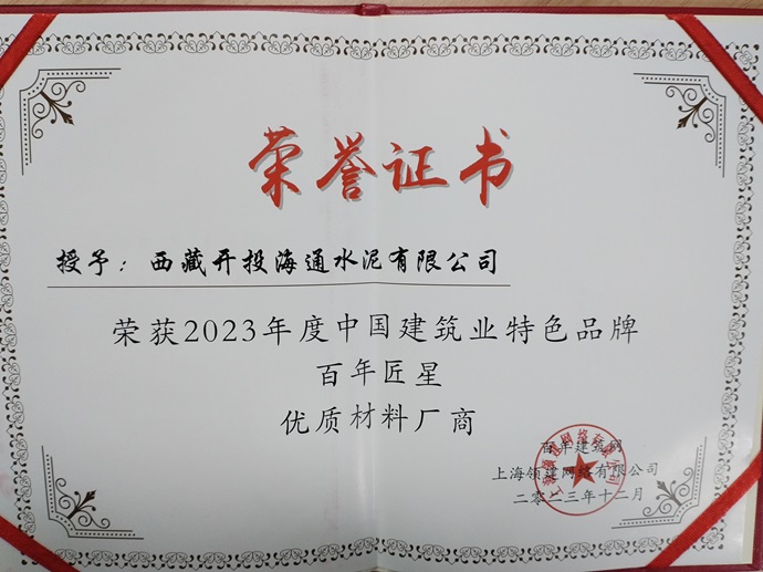 西藏開投海通水泥公司榮獲中國建筑業(yè)特色品牌百年匠星優(yōu)質(zhì)材料廠商榮譽(yù)稱號(hào)