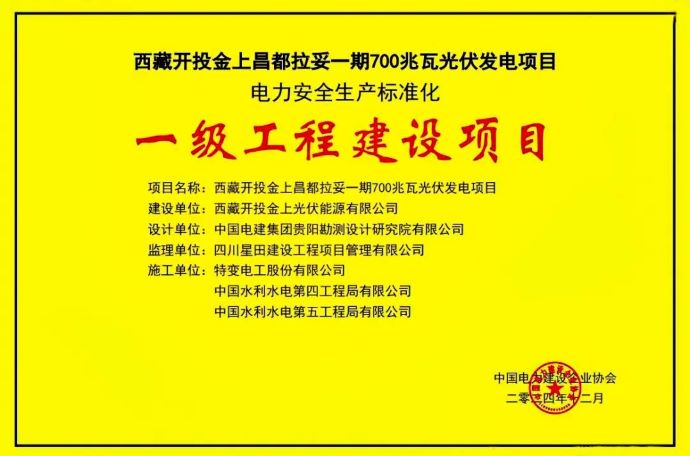 西藏開投金上昌都拉妥一期700兆瓦光伏項(xiàng)目于12月順利通過電力建設(shè)工程安全生產(chǎn)標(biāo)準(zhǔn)化一級(jí)評(píng)審,榮獲中國(guó)電力建設(shè)企業(yè)協(xié)會(huì)頒發(fā)的“電力安全生產(chǎn)標(biāo)準(zhǔn)化一級(jí)工程建設(shè)項(xiàng)目”榮譽(yù)。