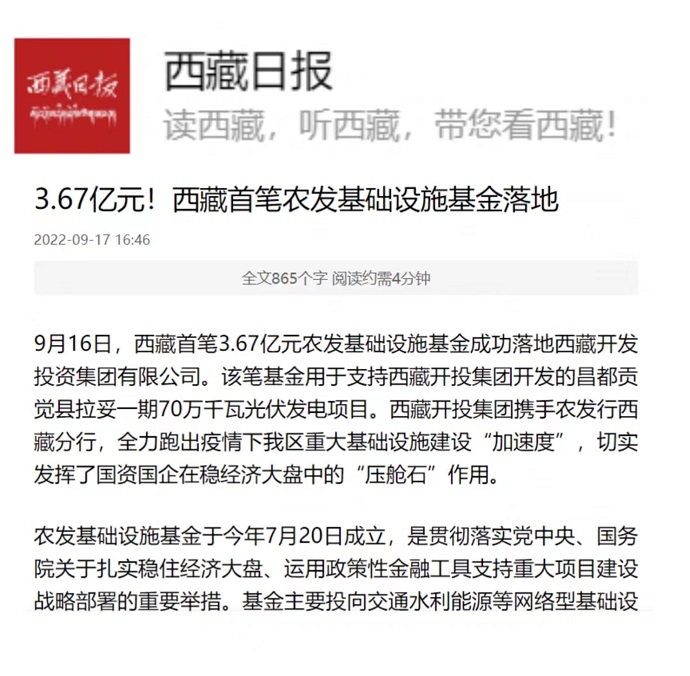 (編者按)《西藏日報》2022年9月17日報道西藏首筆農(nóng)發(fā)基礎(chǔ)設(shè)施基金落地西藏開投集團(tuán)。全文如下: