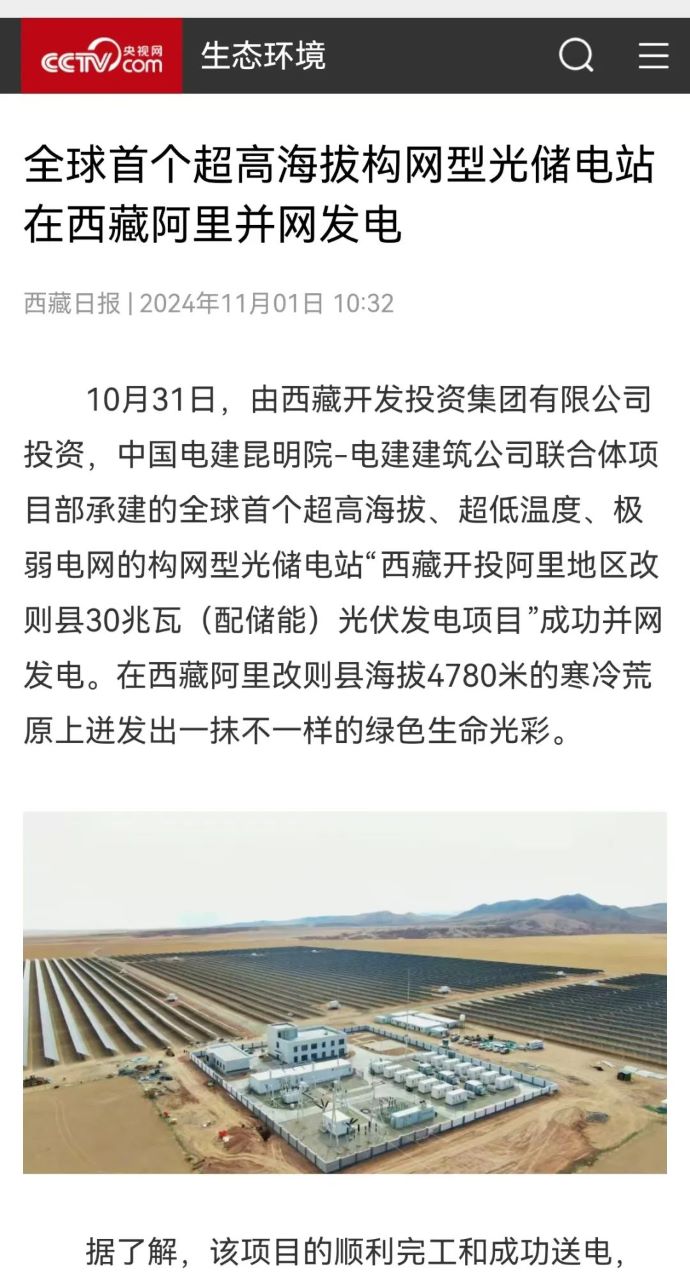 10月31日,由西藏開投集團投資、中國電建昆明院-電建建筑公司聯(lián)合體項目部承建的,全球首個超高海拔、超低溫度、極弱電網(wǎng)智能組串式構(gòu)網(wǎng)型光儲電站——西藏開投阿里地區(qū)改則縣30兆瓦(配儲能)光伏發(fā)電項目,成功并網(wǎng)發(fā)電,標志著新能源技術(shù)在高原地區(qū)的重大突破。