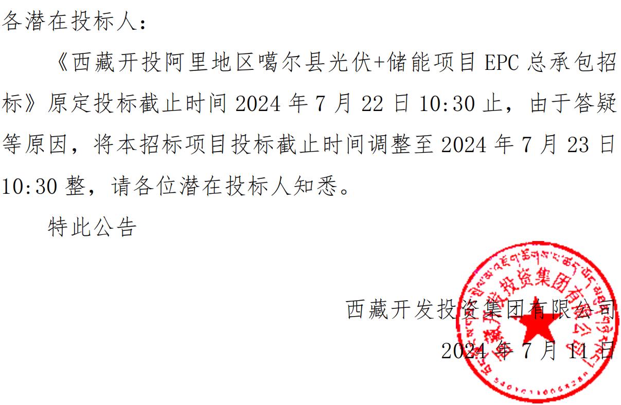 關(guān)于延長(zhǎng)《西藏開(kāi)投阿里地區(qū)噶爾縣光伏+儲(chǔ)能項(xiàng)目EPC總承包招標(biāo)》投標(biāo)截止時(shí)間的公告