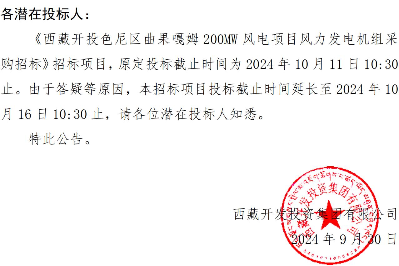關(guān)于延長《西藏開投色尼區(qū)曲果嘎姆200MW風(fēng)電項(xiàng)目風(fēng)力發(fā)電機(jī)組采購招標(biāo)》投標(biāo)截止時間的公告