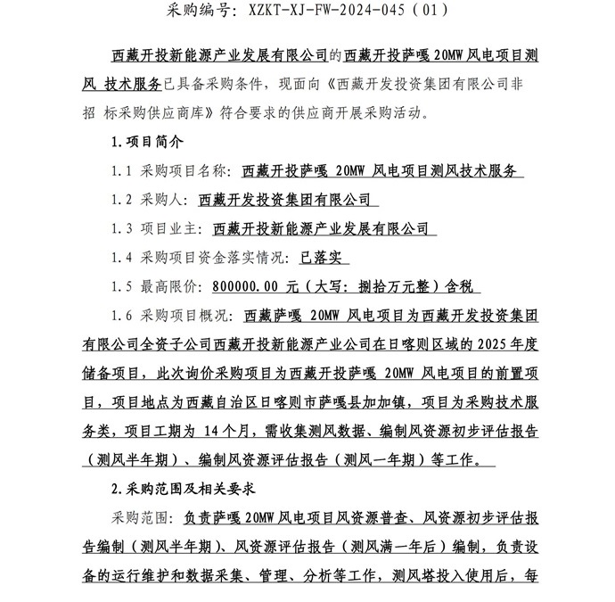 西藏開(kāi)投薩嘎20ML風(fēng)電項(xiàng)目測(cè)風(fēng)技術(shù)服務(wù)詢價(jià)采購(gòu)公告(第二次)