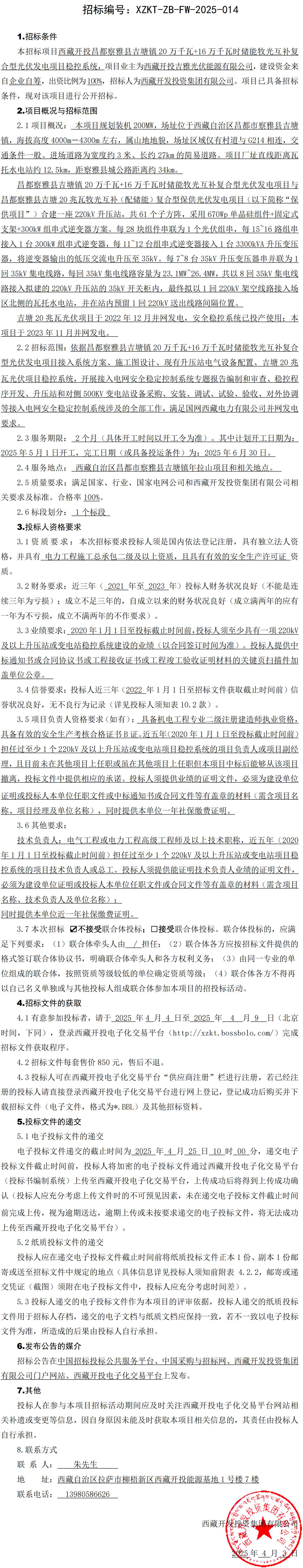 西藏開投昌都察雅縣吉塘鎮(zhèn)20萬千瓦+16萬千瓦時儲能牧光互補(bǔ)復(fù)合型光伏發(fā)電項(xiàng)目穩(wěn)控系統(tǒng)招標(biāo)公告
